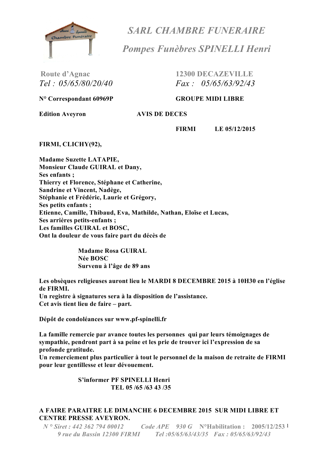 Décédée à Decazeville (12300, France) le samedi 5 décembre 2015 à l'âge de 89 ans